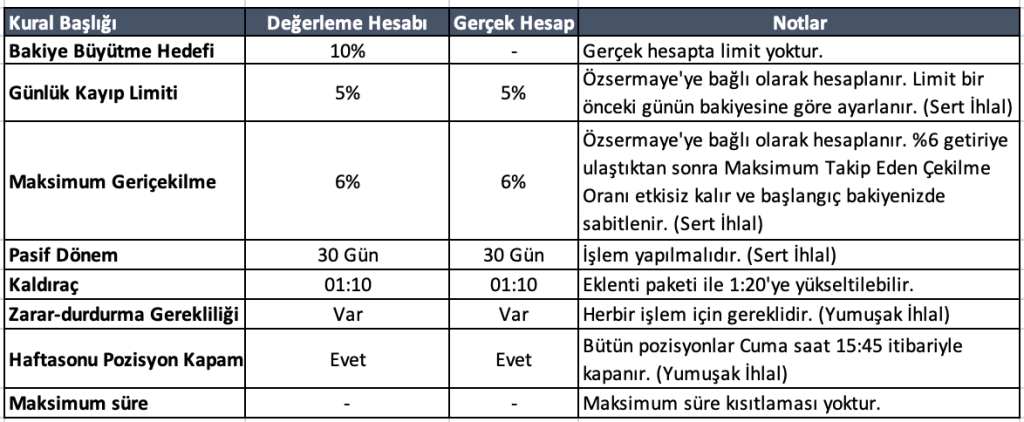 Hesap kuralları ve limitleri normal bir Canlı Hesap ile aynıdır. Özellikle yumuşak ihlal, sert ihlal, günlük kayıp limiti, maksimum takip eden çekilme, zararı durdurma ve pozisyon limitleri için geçerli olan tüm koşullar ve kurallar her iki durum için de aynıdır.